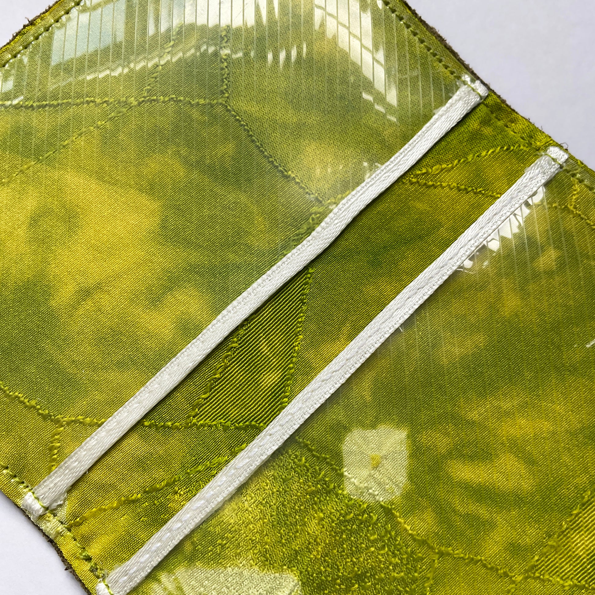 I make my cardholders by hand from leather, lined with recycled kimono silk from Japan: they have plastic inserts, top and bottom, edged with ribbon.