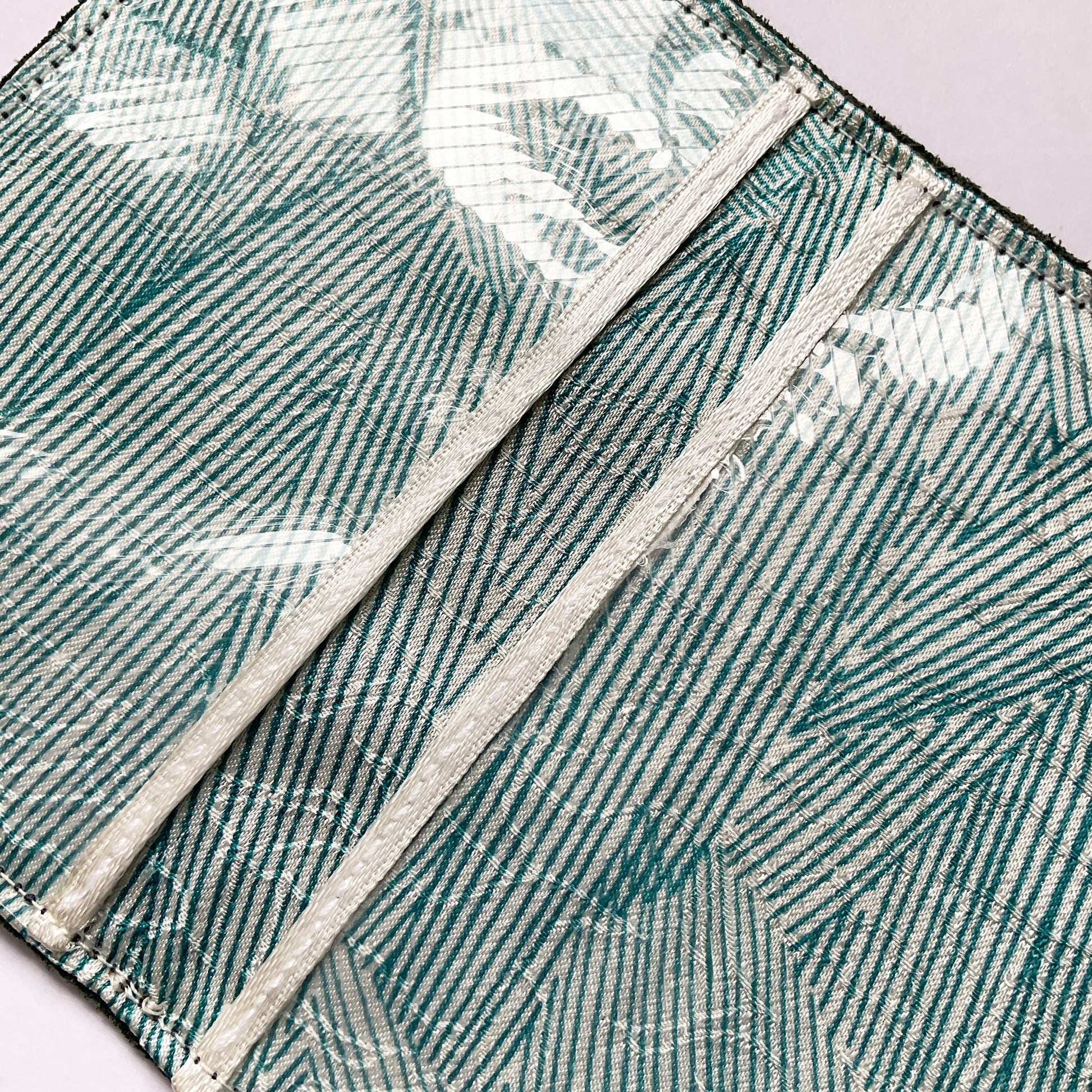 I make my cardholders by hand from leather, lined with recycled kimono silk from Japan: they have plastic inserts, top and bottom, edged with ribbon.