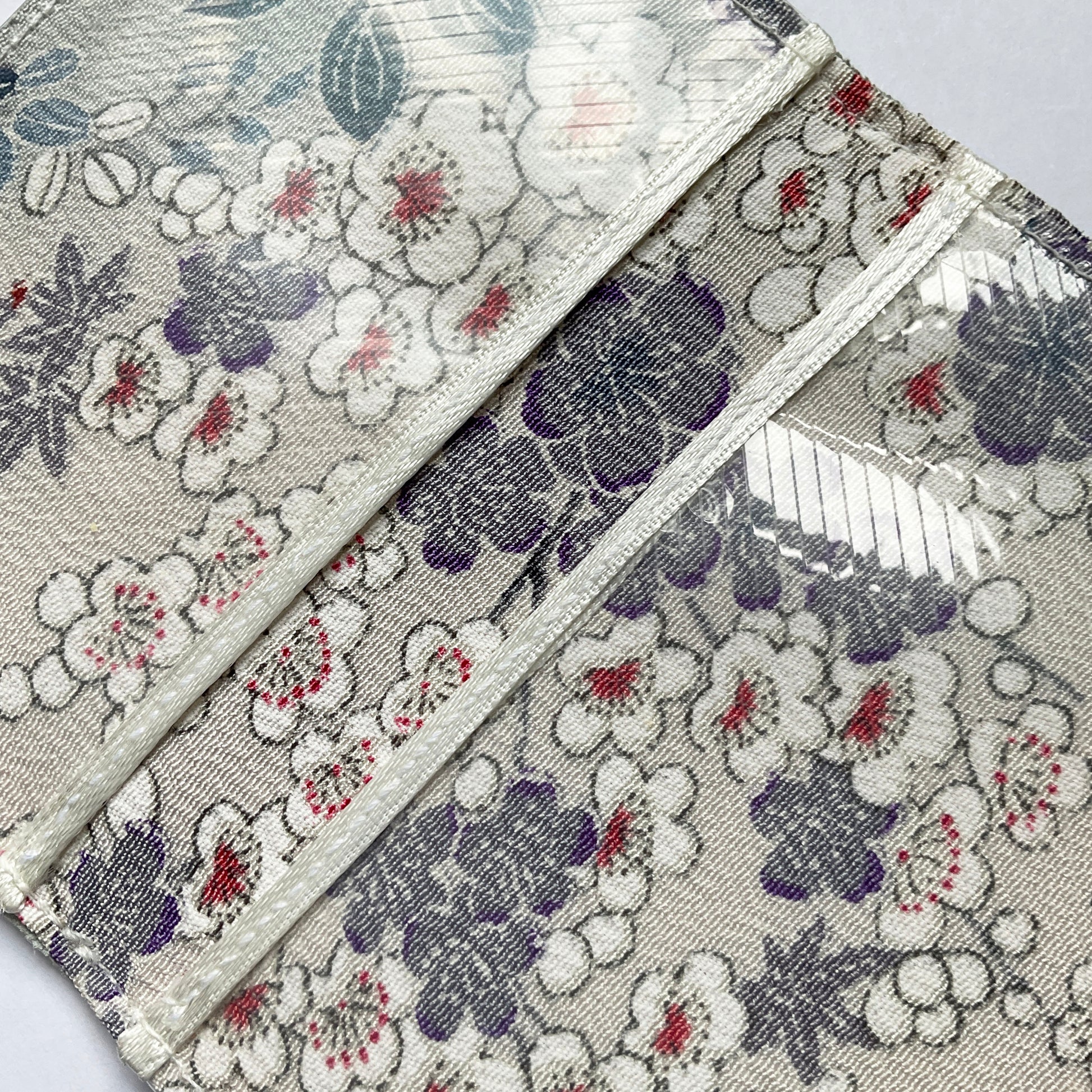 I make my cardholders by hand from leather, lined with recycled kimono silk from Japan: they have plastic inserts, top and bottom, edged with ribbon.