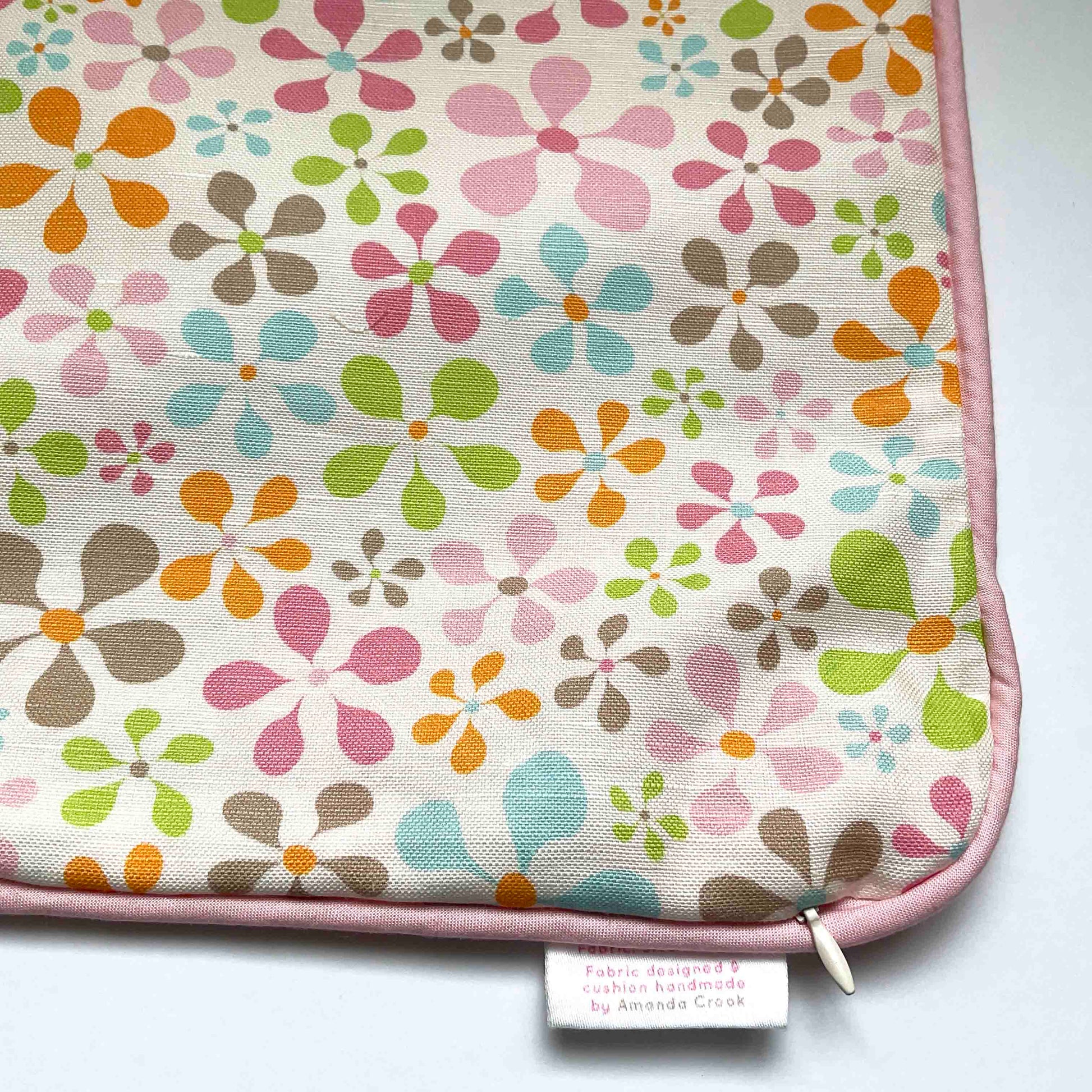 This small linen-cotton cushion cover features my Bloom pattern, in colour palette Bella – pinks, orange, nutmeg, green and blue.