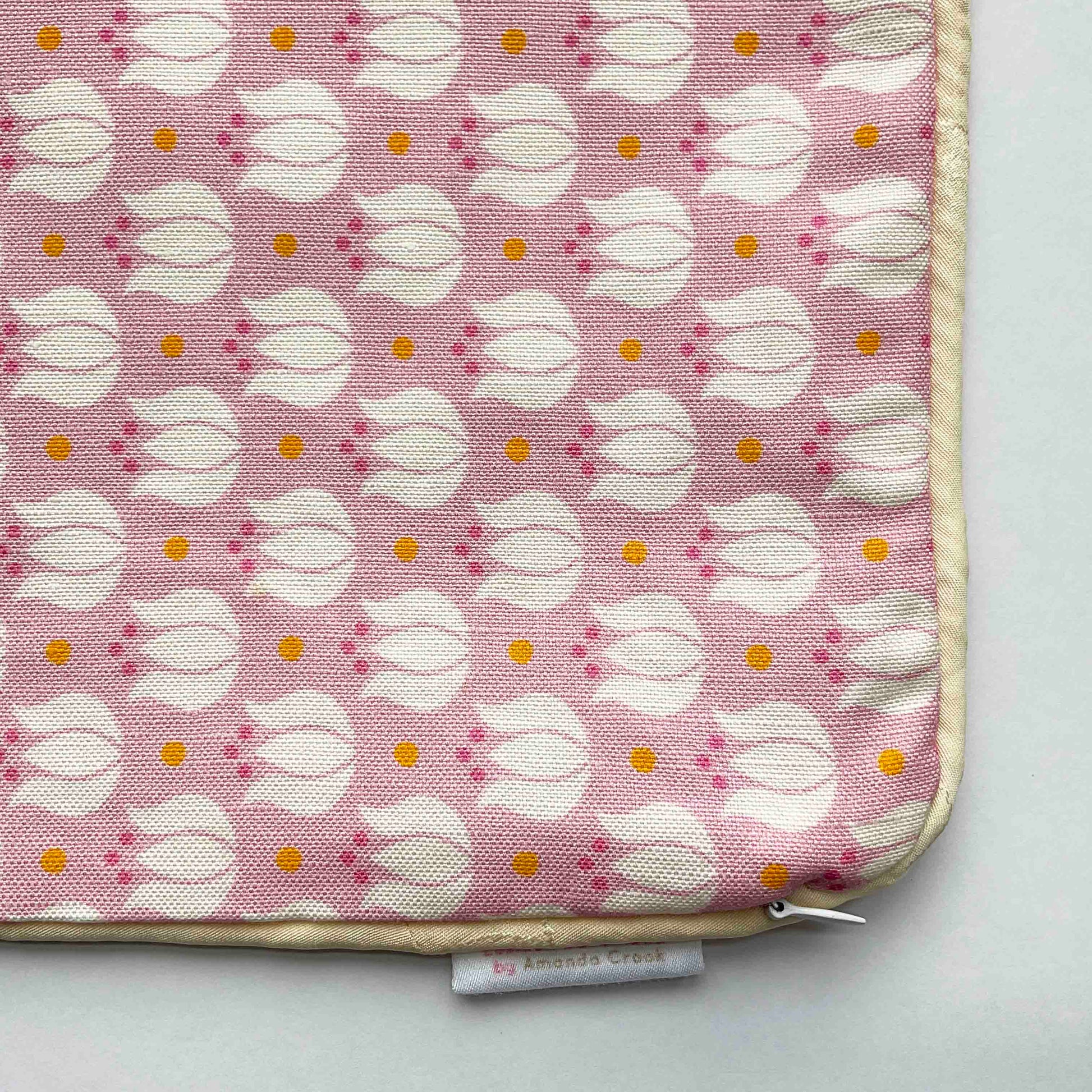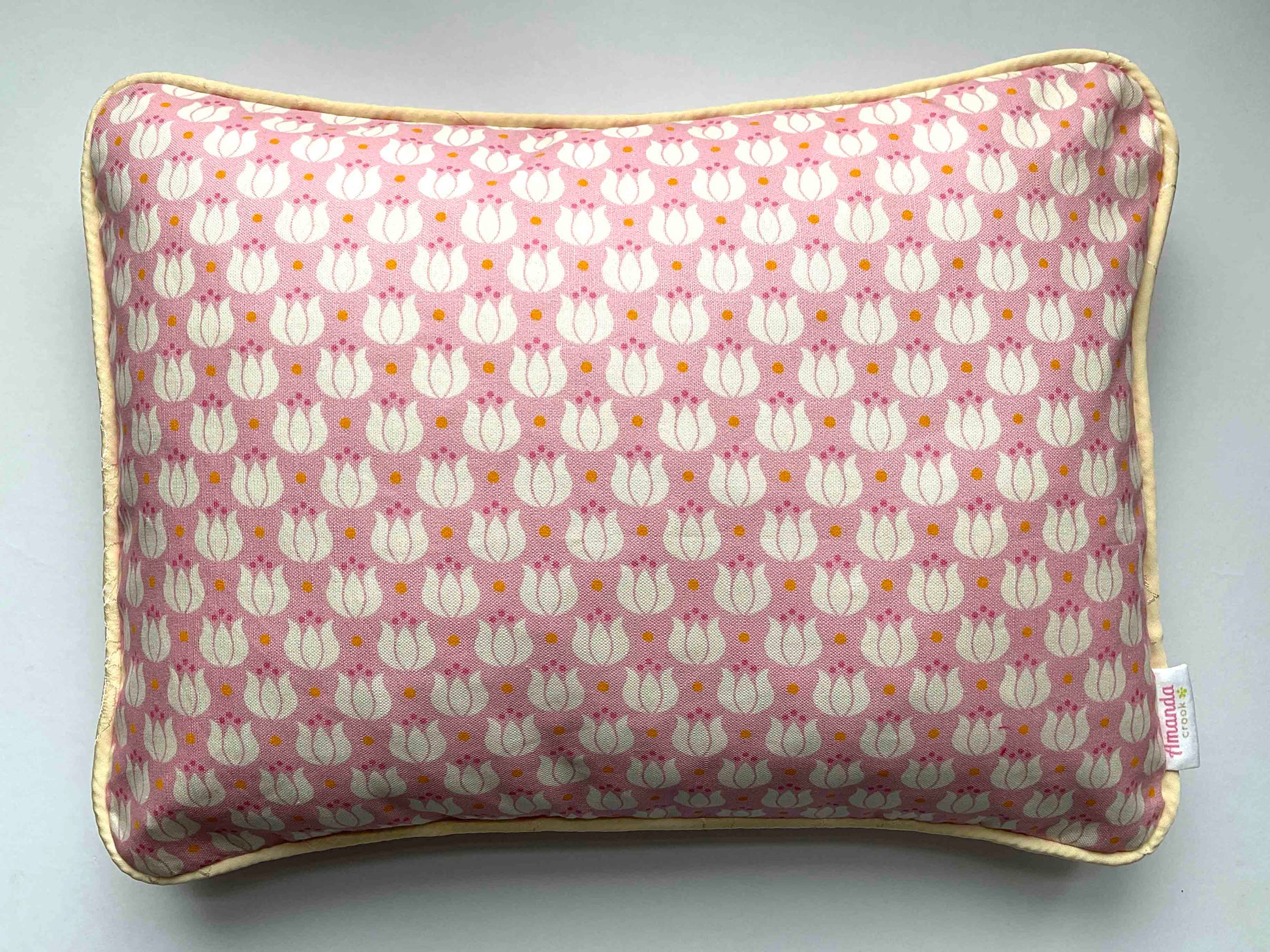 This small linen-cotton cushion cover features my Lotus pattern, in a pink colour palette – pinks, orange and cream.
