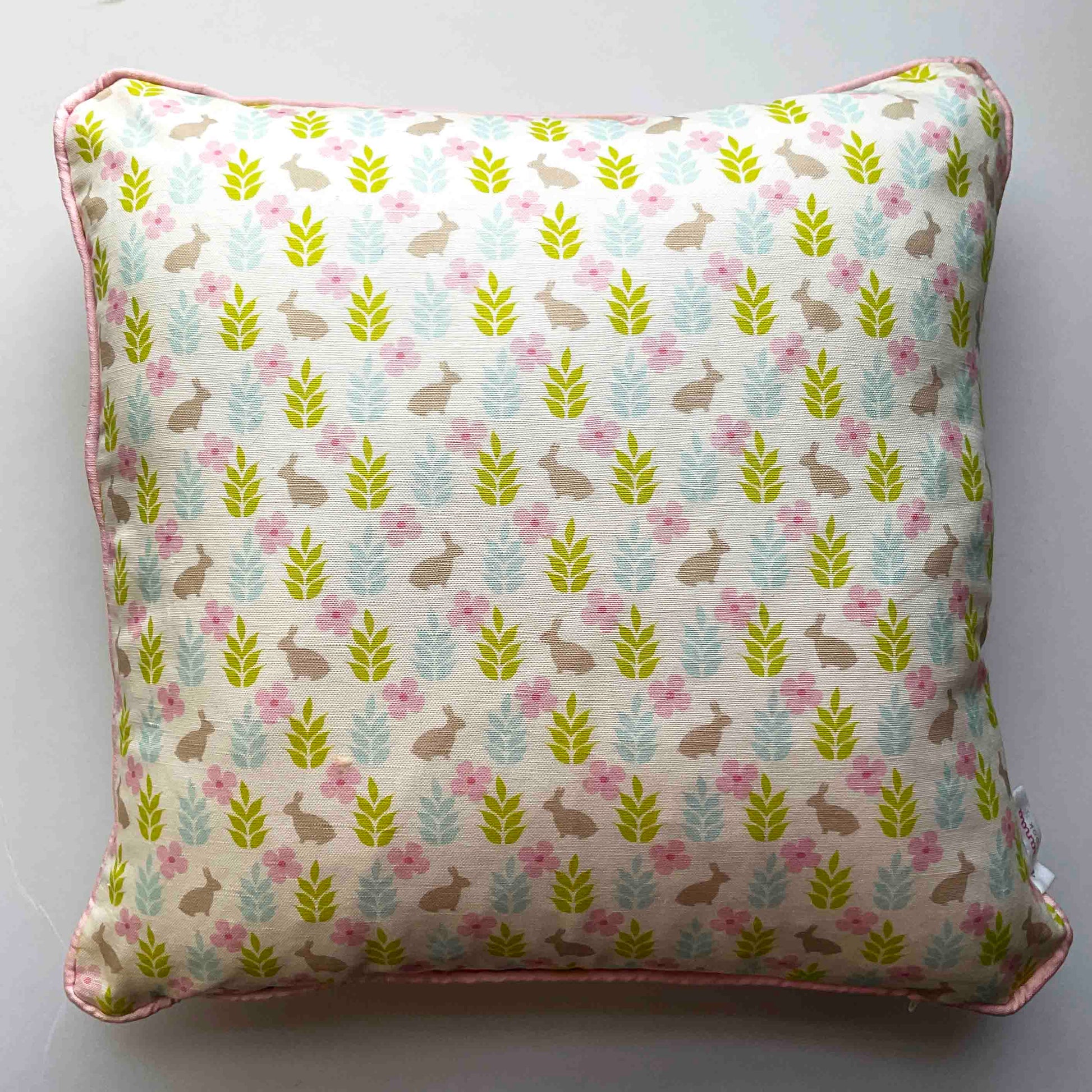 This small square linen-cotton cushion cover features my Rabbit pattern in colour palette Bella – with pinks, nutmeg, green and blue.